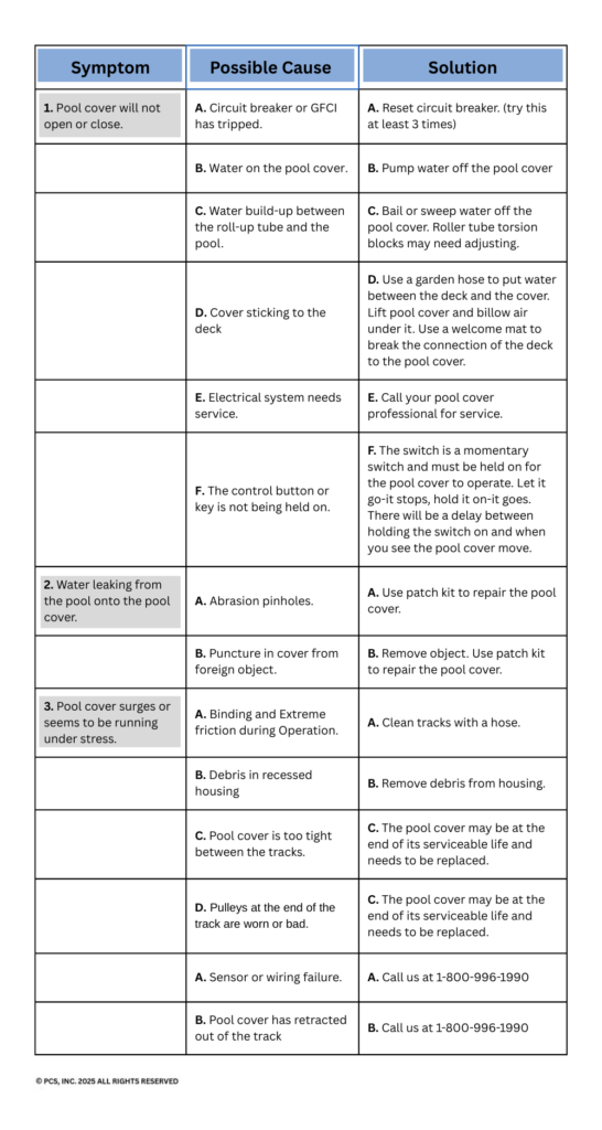 Call Pool Cover Specialists at 1-800-996-1990 immediately for service or assistance.